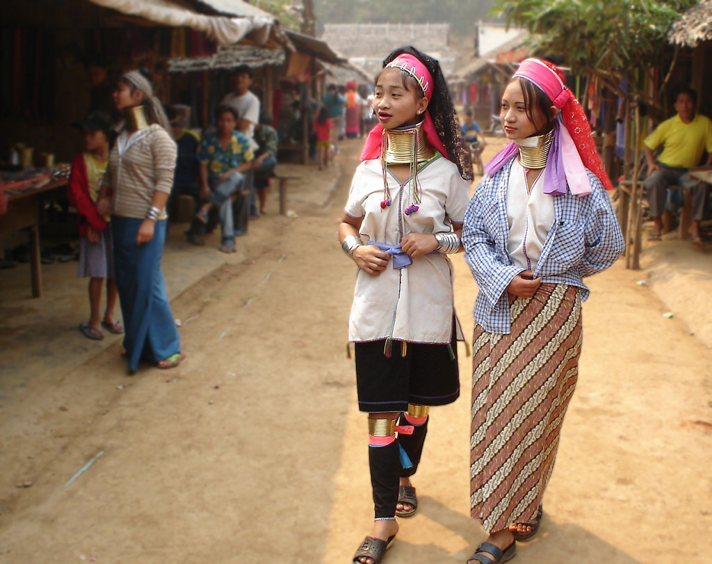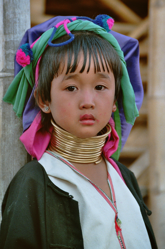 Theo truyền thống ở đây thì những bé gái bắt đầu được đeo những chiếc vòng cổ đầu tiên khi mới 5 hoặc 7 tuổi, theo thời gian số lượng vòng cổ sẽ tăng lên thời gian cho tới khi họ 25 tuổi thì không mang them nữa. Cổ của họ thật ra cũng như chúng ta nhưng vì phải đeo nhiều vòng cổ nên theo thời gian khiến cho xương bả vai bị chùng xuống, các đốt sống cổ dài ra nên thoạt nhìn bạn có thể hết hồn vì cổ của họ có thể cao gấp đôi người bình thường.