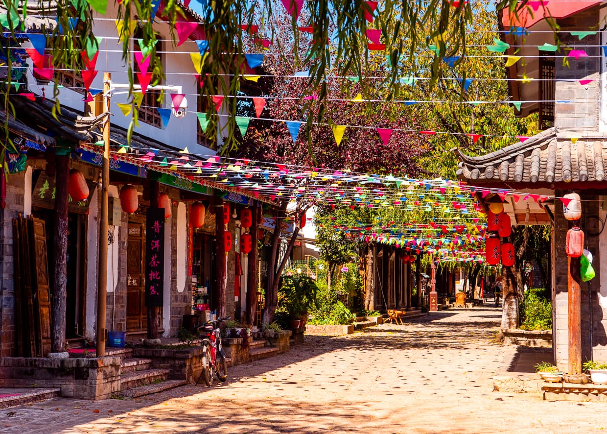 Những con hẻm chật hẹp của thị trấn cổ và vỉa hè lát đá cuội làm tăng thêm cảm giác bình yên xưa cũ khiến bạn cảm thấy như mình đang trong tác phẩm điện ảnh thuộc triều đại nhà Thanh. Trải qua gần một nghìn năm lịch sử, kiến trúc nhà cửa ở đây vẫn giữ nguyên được nét cổ kính của sự pha trộn kiến trúc của các dân tộc Hán, Bạch, Tạng, Nạp Tây bản địa in dấu trên từng ngôi nhà và những cây cầu. Đẹp yên bình trong khung cảnh của từng dãy nhà, từng con đường, từng góc nhỏ nhưng cũng tấp nập đông vui trong hoạt động hàng ngày của người dân và khách đến.