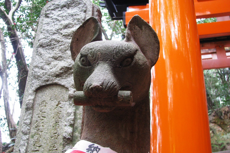 Trên đường đi, bạn sẽ thấy hang trăm bức tượng cáo làm từ đá, nhưng nổi bật nhất là các tượng cáo đứng gác ở cổng chính của điện thờ. Trong tôn giáo Shinto, con cáo được coi là một sứ giả của Inari, giải thích lý do tại sao có nhiều tượng cáo trên khắp khuôn viên đền thờ. Những con cáo này giữ trong miệng của chúng các vật tượng trưng, thường là chìa khóa hoặc một cuộn giấy. Mỗi một trong những vật phẩm này đại diện cho một điều ý nghĩa đối với các vị thần. Chìa khóa đại diện cho khả năng những con cáo này phải mở khóa một vựa lúa. Một cuộn giấy có nghĩa cáo ở đây để mang lại sự khôn ngoan cho người nhận. Ngoài ra còn có cây tre có nghĩa là một vụ mùa bội thu, và một quả cầu tượng trưng cho sức mạnh tâm linh.