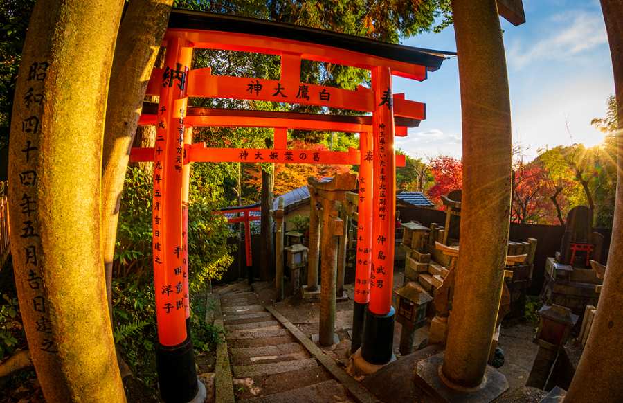 Đền ngàn cột Fushimi Inari là một đền thờ Thần đạo được biết đến với khoảng 10.000 cổng torii màu đỏ son uốn lượn trên một con đường đi bộ dài hai giờ. Ngay sau khi xây dựng ngôi đền, để chứng minh sự đóng góp của những người thờ phượng, một cổng torii sẽ được xây dựng với tên của họ được ghi trên đó. Chẳng mấy chốc, hàng trăm hàng nghìn người muốn có được vận may tương tự và đã đến ngôi đền nổi tiếng này để mua cổng torii của riêng họ, tạo ra đường hầm “Senbon Torii” mà bạn thấy ngày nay.